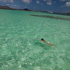 9月17日に午後のBBQツアーに参加しました。カネオヘへのツアーは数回目でしたがこのツアーは初&今まで天気に恵まれた事がなかったのでチョット不安。でも当日は本当にいい天気でした。サンドバーの水深は膝程(これはこの時期の普通だとか)でしたが、色と透明度は本当に美しかったです。スタッフの対応、BBQも期待していなかったのですが、種類、味共にこの手のツアーとしては質が高かったです。シュノケールは自由参加。もともとあまり魚の種類、数は多くないのを知っていたので、私達は船の回りで海の色と透明度を楽しんでいました。ゴーグルつけて泳いでるだけでも楽しいです!別料金でDVD作成が頼めます。頼んだのは私達だけでしたが頼んでヨカッタです(投稿写真1枚目は撮ってもらったものです)。$45でした。1度見ておいて損はない海の色と透明度だと思います。ちなみに海亀は船から見るだけなので、海亀目的ならば他のツアーがいいかも。