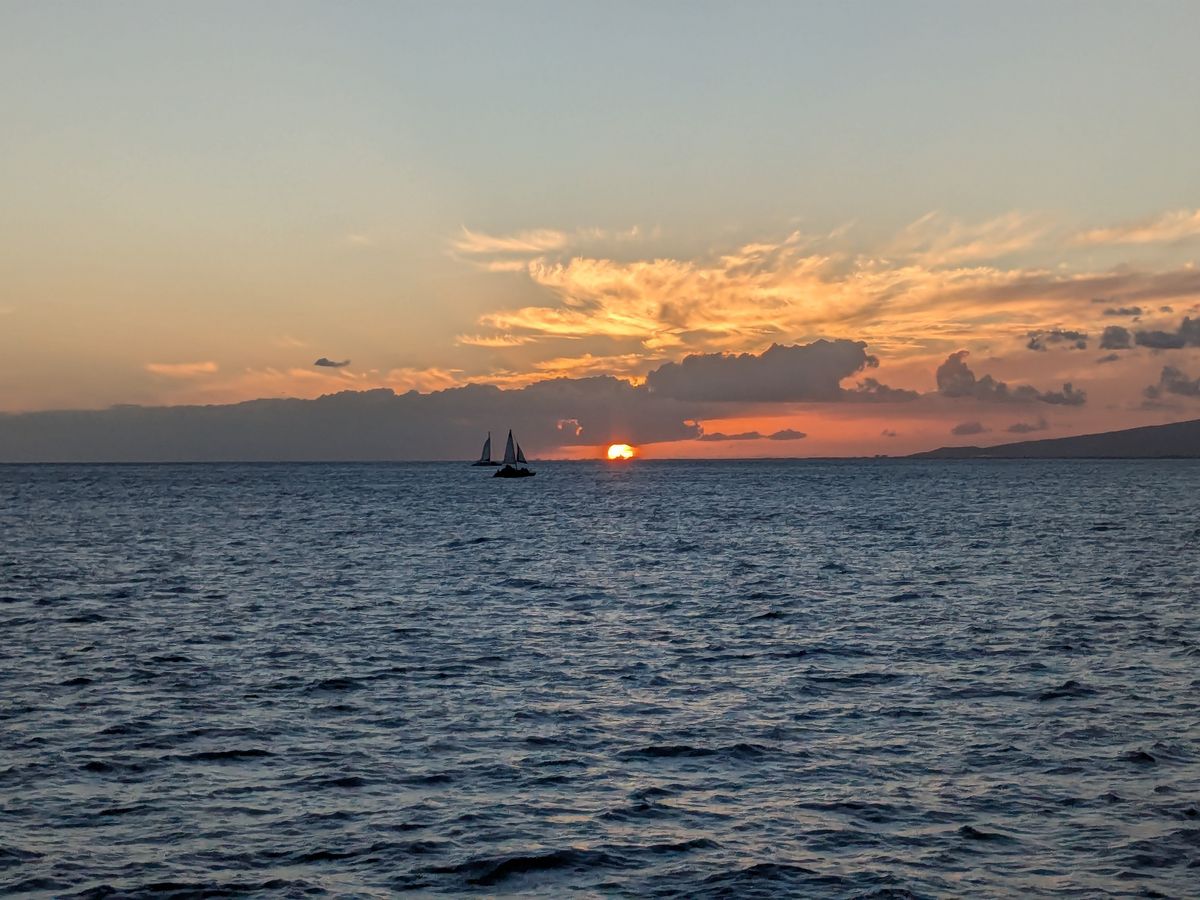 When I go to Hawaii, I always end up on a catamaran. It's great to spend an hour and a half cruising the open sea while enjoying drinks. This time, one of the female staff members cast a fishing line, and towards the end, she caught an impressive big fish, which was quite a surprise!