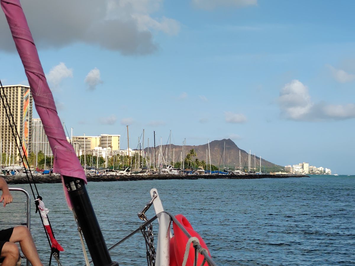 沖合から見るダイヤモンドヘッド、ワイキキビーチは最高です。また風も吹いてヨットとしての走りも最高、さらにイルカの並走、ウミガメにも遭遇し最高のクルージングでした。私がヨット経験者だと伝えるとキャプテンの計らいでウインチ作業、舵も握らせて貰い、最高の思い出になりました。キャプテン、クルーの皆さん有難うございました。初めて乗った同僚もヨットのクルージングに大満足しておりました。