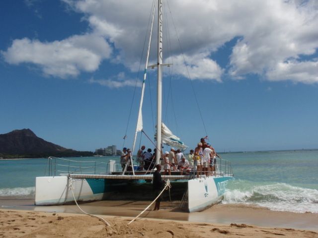 集合場所まで徒歩で向かいました。場所はすぐに分かります。時間通りにヨットは出発しました。20分ほどで目的地のワイキキ沖に着き、ゴーグルや浮きの使い方や見える魚の説明があり、その後1時間シュノーケルを楽しみました。風も穏やかで揺れも少なく、海の透明度は良く大小の黒い魚がたくさんみえました。持参の水中カメラが活躍しました。ヨットの上で、ソフトドリンク1ドル・ビール3ドルで買えます。残りの時間は、ワイキキ沖をセーリングしながら帰ります。かなり沖の方やダイヤモンドヘッド近くまで行きました。その時、ヨットの近くにイルカやカメがよってきました。