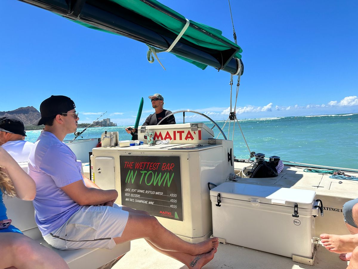 This is my third time on the boat, and I really recommend it. This time, I was worried about the high waves because it was a windy day, but the wind felt nice, and out at sea, they turned off the engine and used only the sails, allowing us to enjoy the calm environment with the ocean and Diamond Head.