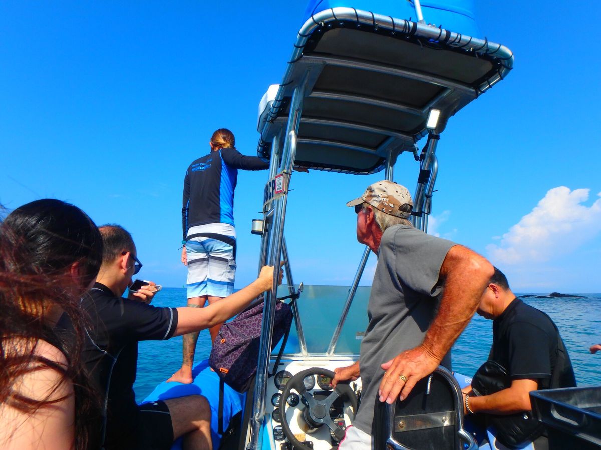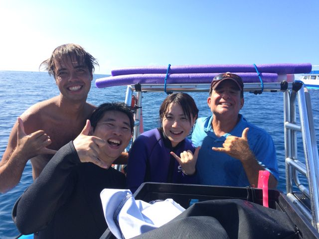 As soon as we set off, we met a turtle, and within ten minutes, we dove at a point filled with dolphins both to the side and directly below us, which was quite an adrenaline rush. When I turned to the side, a mother and baby dolphin swam by slowly, as if saying, "Hello." Our guide, Dai-chan, advised us in the car that it’s good to be aware with our "third eye," which made the experience feel quite mystical with the dolphins. I would love to experience this again in Kona.