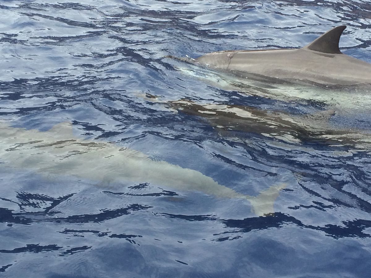 出発して、すぐに亀さんに会い、10分もしないうちにポイントでダイブ、横も、真下もいるかだらけで、かなりアドレナリンでました。ふと横を向いたら、親子のイルカさんが、「こんにちは」と言ってくれてるような視線でゆっくりと泳いでいきました。ガイドのダイちゃんが、第三の目で意識するといいですよと、迎えの車のなかでアドバイスをくれたので、なんだか、不思議な気分をイルカさんと過ごした感じです。また、コナで体験したいです。