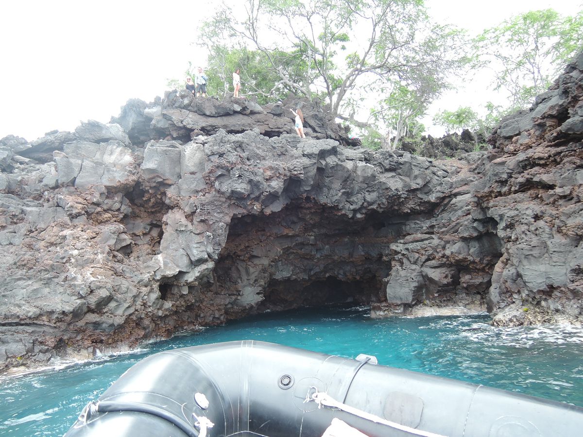 シュノーケリングが終わると、出発地に戻りますが、今度は岸沿いに洞窟見学をしながら1時間ラフティングです。猛スピードで岸に向かい、ぶつかりそうなところでターンをしたり、わざと高い波に向かってジャンプしたりと、サービス精神満点でした。