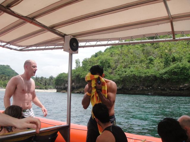十分シュノーケリングを楽しんだ私たちは、体が冷えてしまって一番に海からあがりましたが、外人さんは平気で私たちより10分以上長く泳いでいました。シュノーケルの後の船の上のランチは美味しかったな~。それから、船長さんが、「いるか」がいる場所に連れて行ってくれました。感動したのですが、ゾディアック号でへとへとの私は、いるかの高速な泳ぎを見ているだけでどっと疲れが出ました。陸にもどってこられて、本当に良かったです。