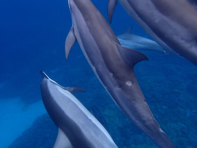 We were really lucky that day, as we saw three manta rays before swimming with the dolphins. After that, we encountered dolphins that happened to be in a good mood, and we could hear their sounds and meet many dolphins. Our guide, Daisuke, worked hard to lead everyone to where the dolphins were, allowing us to see them up close, which was truly moving. The dolphins were also swimming around him playfully.