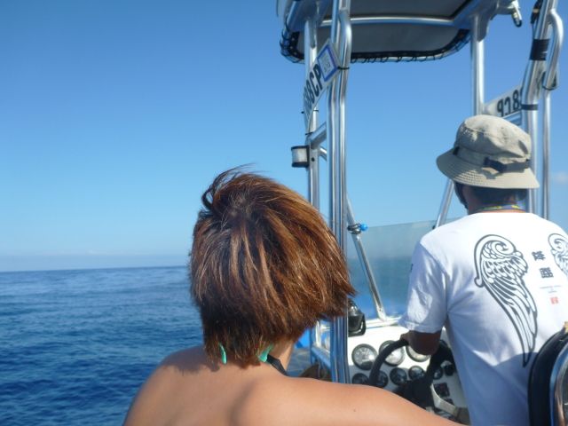 Our guide Daisuke was in the water, and Mr. Nawata was on the boat, both working hard to guide us, saying things like, "Just 5 meters out! There! Stay right there! They’ll be coming in about 20 meters!"