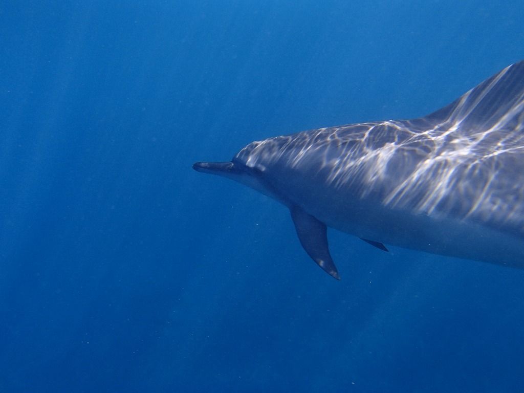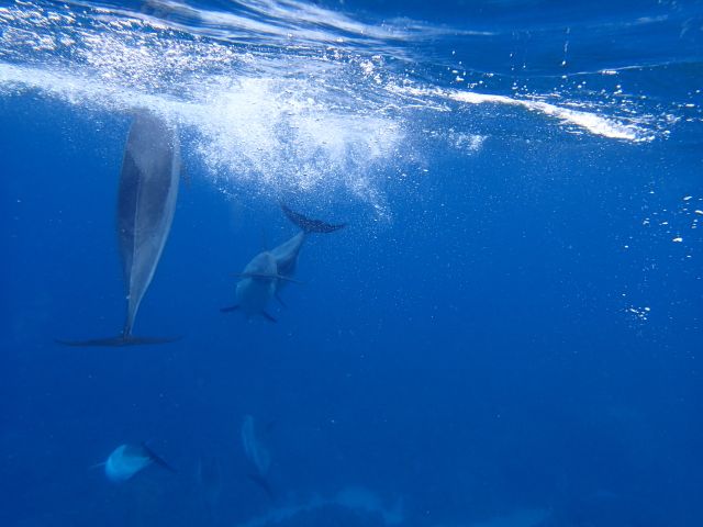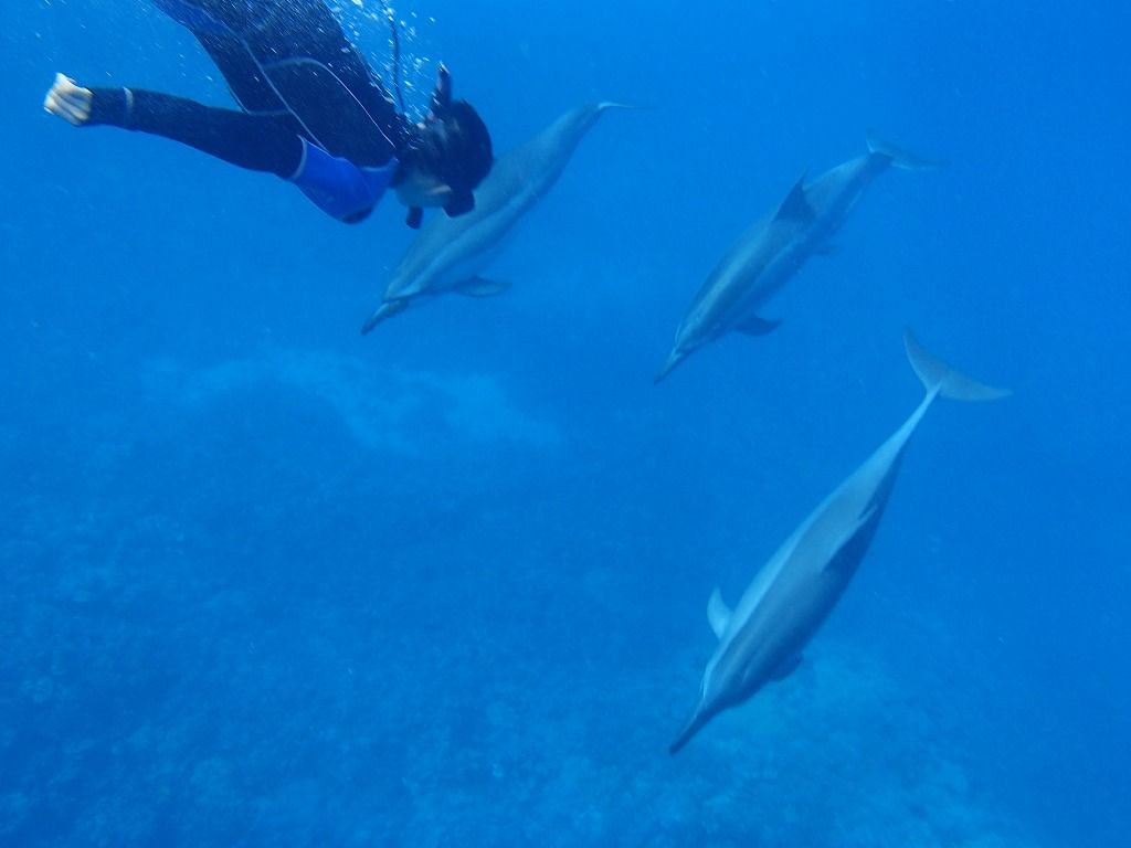 先回りして海に入りイルカ達を待っているとだんだん鳴き声が近づいてきてイルカが私の下を泳いで行きます。