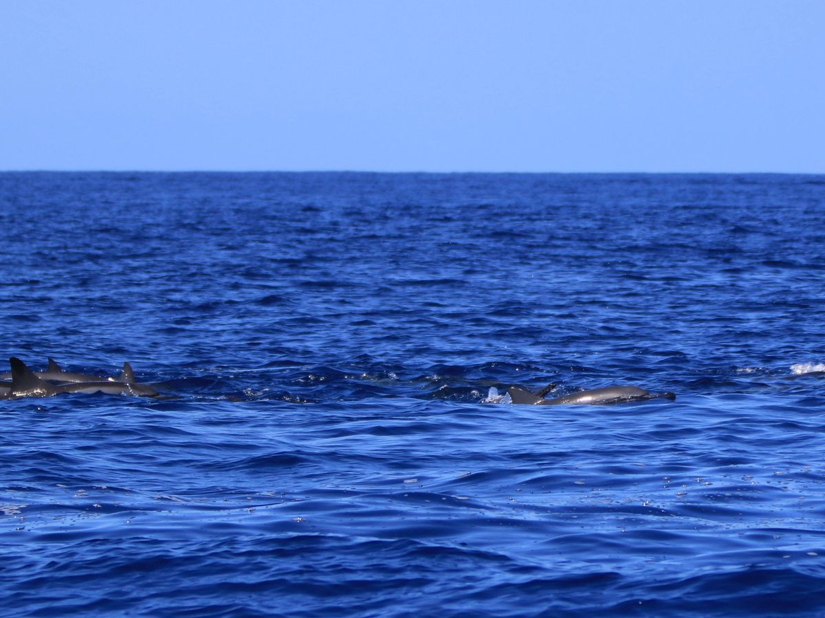 ガイドのダイスケさん、レイさん、コウイチロウさんは イルカのいる方向を優しく教えてくれるだけでなく、船に残った一人が海面の全員への目配りを怠らず、安全に快適にイルカの動きを間近に見て泳げました。