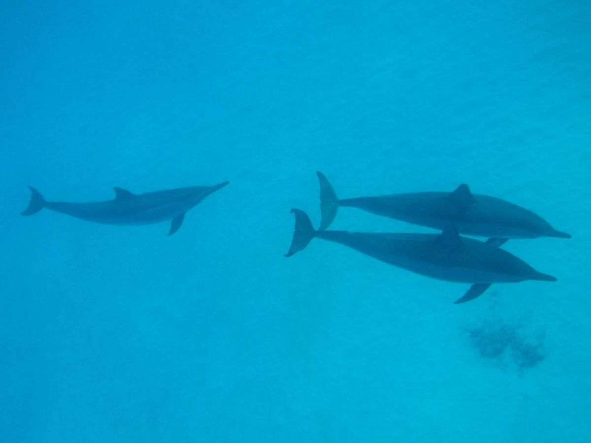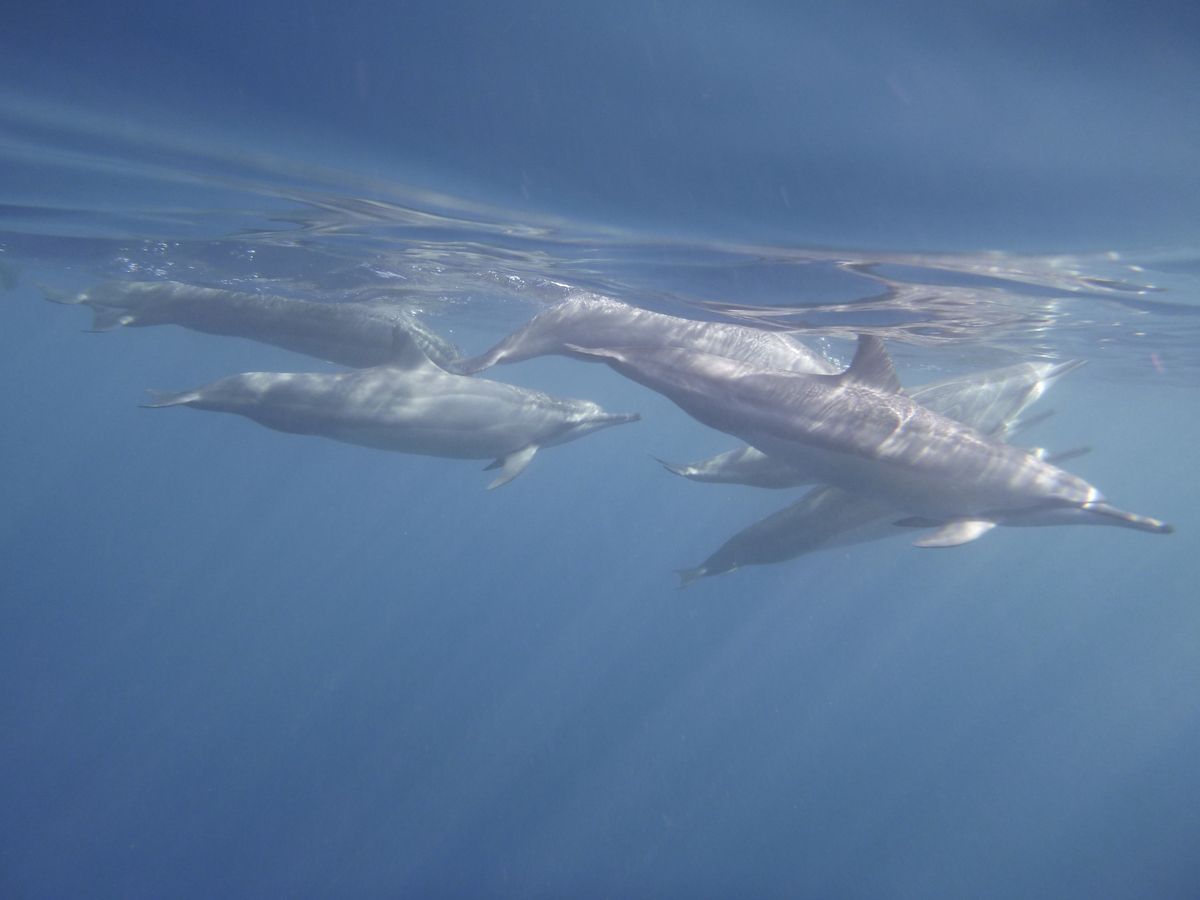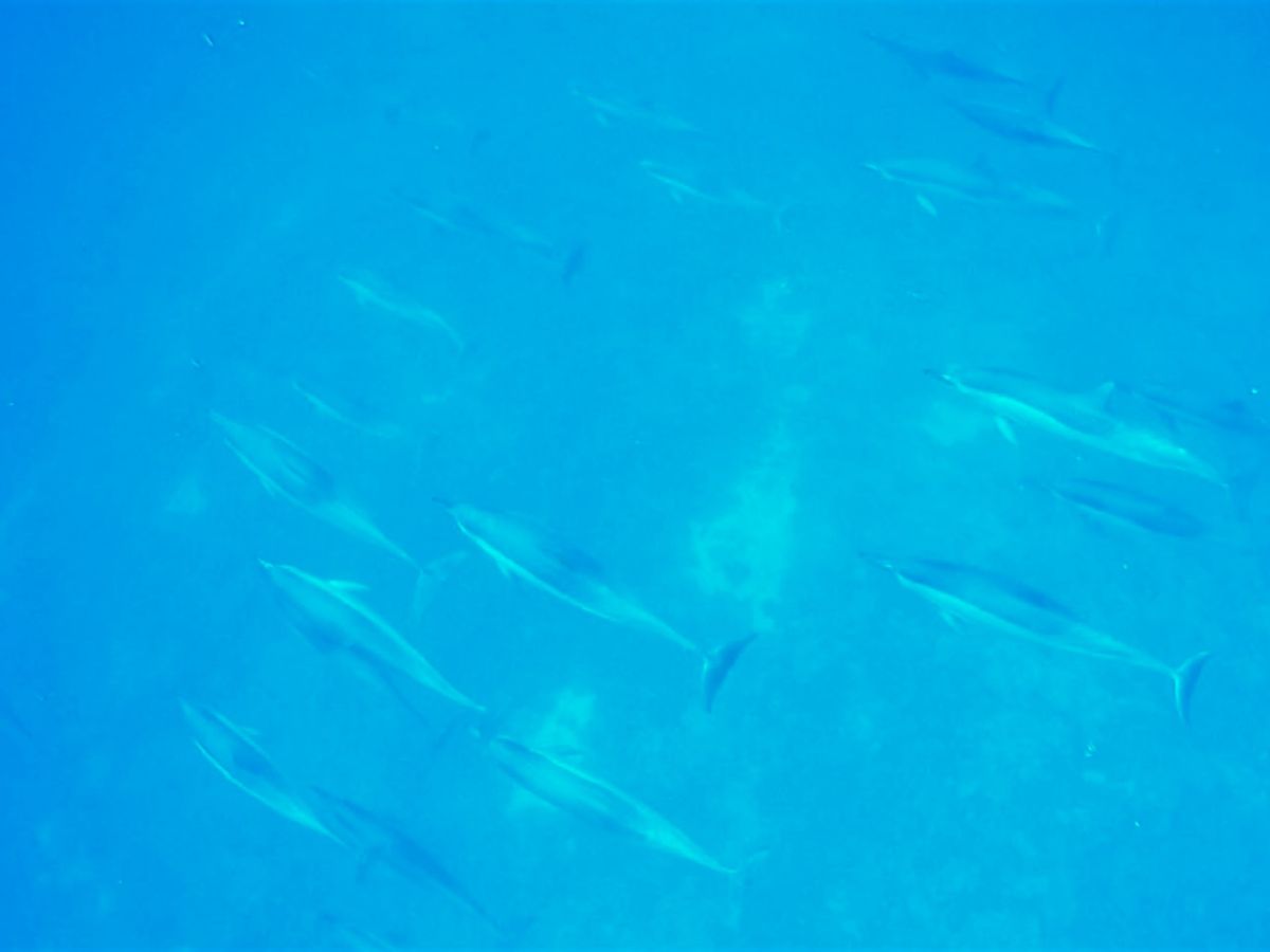 Fortunately, I encountered dolphins at a reef where they only play when they're in a good mood. It was a wonderful experience. It was truly a playful interaction with the dolphins. They didn't just swim past me; I was surrounded by dozens of dolphins from all sides, even at my feet—it felt like a dream.