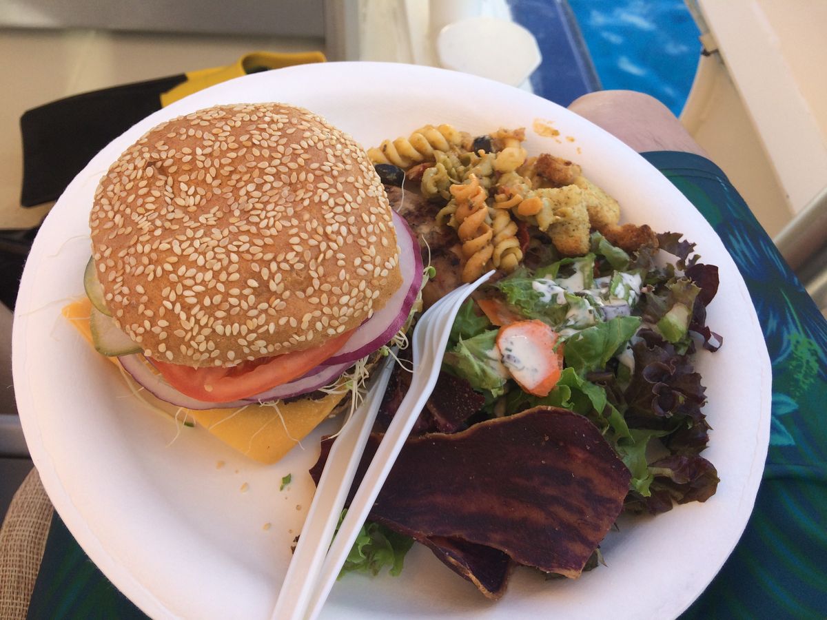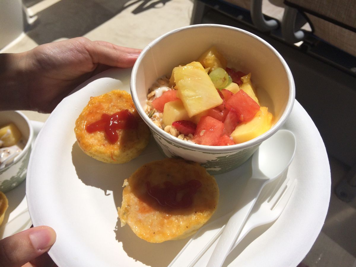 朝食はパン、マフィン、フルーツ、卵焼き?、飲み物、お昼はハンバーガーとパスタ。