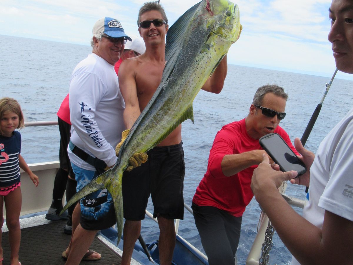 大きな声がして船内の後方をみるとなんと、おじさんが反応のあった釣り糸と格闘中。みんなで応援して、大きなシーラが出てきたときは、船内は大盛り上がりでした。