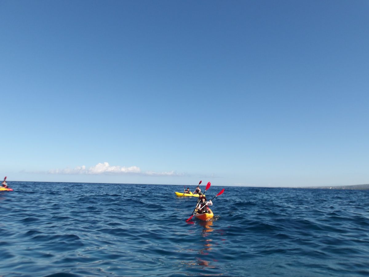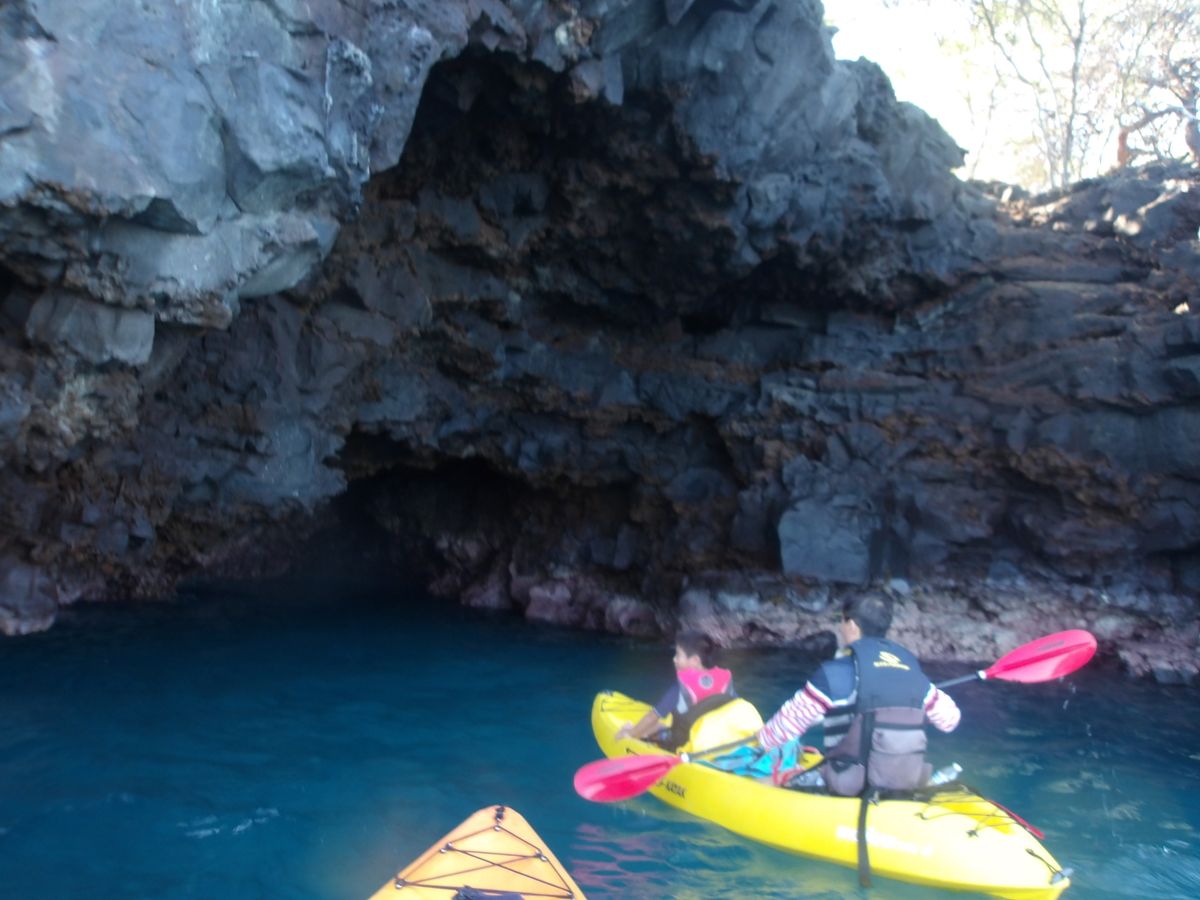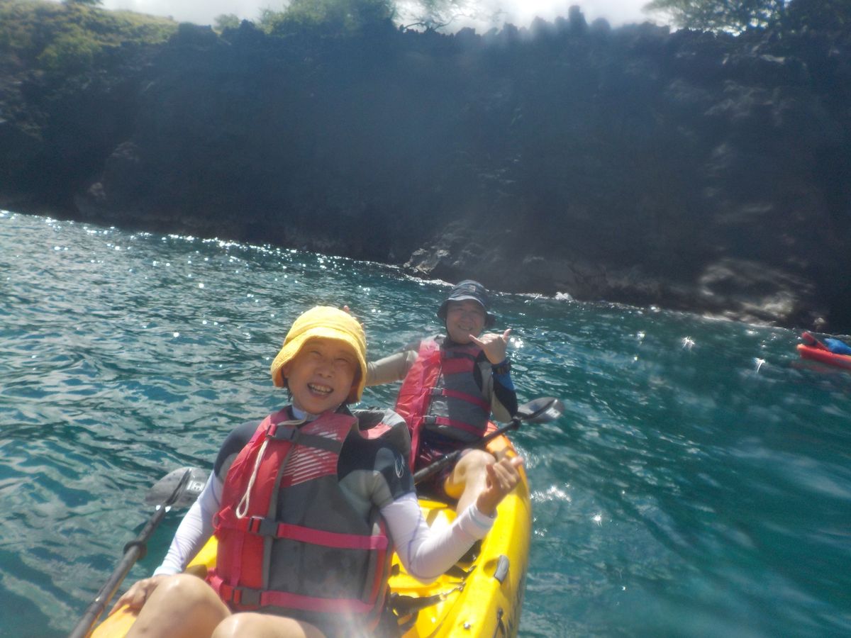 カヤックは安定感があり漕ぐほどに慣れてきました。ケアホウ湾を出て次の入江にある海中洞窟までがコースです。海が濃い青に変わるくらい沖に出ます。途中何度か休憩と水分補給をしながら進みます。波もなく穏やかでイルカが飛び跳ねていました。ガイドによれば子イルカがジャンプの練習をしているとのこと。ラッキーでした。シュノーケリングは風のためケアホウ湾の中で20分ほどで、もっと沢山の南の海のお魚達を期待していたので少し残念でした。日本語が殆ど通じないビッグアイランドでガイドのノニさんと日本語での会話はそれだけでほっとしました。是非参加されることをお勧めします。