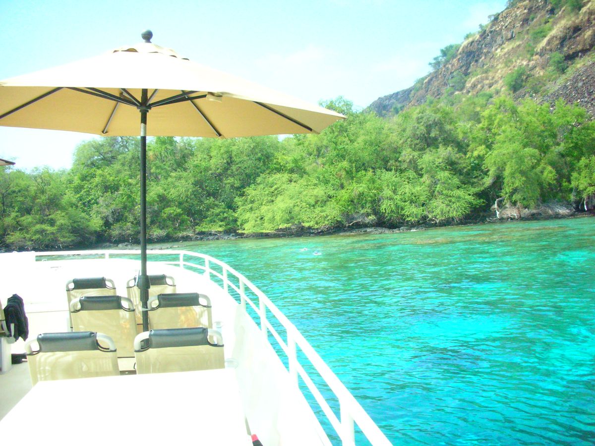 帰りは船の上からハワイ島の景色を見ながらシュノーケリングの心地よい疲れと海風でうたた寝してしまいました。