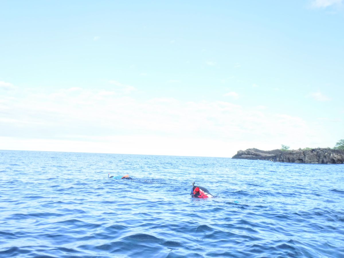 波は凪とはいかずまあまああり左岸沿いに進みホテル1階レストランを見ながら、次の入り江の洞窟に向かいます。洞窟入口は打ち寄せる波は吹き戻る、右岸沿いにカヌーを進め波打ち際より100m位でカヌーからシュノーケリングエントリー前日は雨もあり透明はまあまあ黄色いはぎ、ウニ、エイを追って泳ぐとカヌーがあり、なんか騒いでる''イルカ、イルカ''周りにイルカ、イルカの赤ちゃんがスピンジャンプ。楽しかったです!