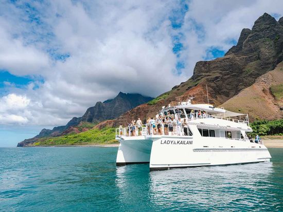 • Cruise along the Na Pali Coast on a spacious and luxurious catamaran with views of sea cliffs, waterfalls, and Hawaiian marine life.