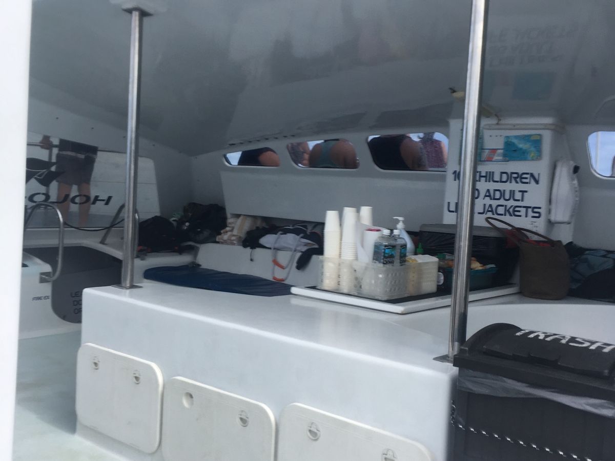 カタマランなのでそれほど大きくは揺れませんが、クルージングの時間が長いので、慣れない人は船酔い注意。