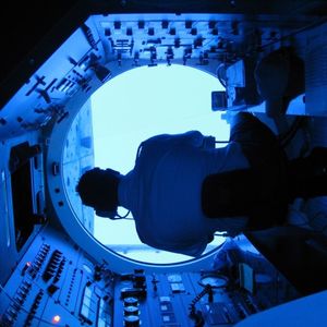 ガラスの厚さ15cm位、直径40cm程の丸い窓から水中を見ます、、、