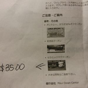 記念品クーポン・セラミックマグクーポンを貰えるようので、ディスカウントがないにもかかわらず事前購入しましたが、土産物を35ドル以上買わないと対象外とのこと。