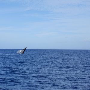 遠くでムナビレをバチンバチンとしているクジラに向かっていくと、なんとかなり近くでブリーチング突然だったので最後の波しぶきぐらいしか見えませんでした。そのあともう一回ブリーチングしてと祈りながらカメラを向けているとブリーチングしました。結局10回ものブリーチング、ムナビレをバチンバチン多数、尻尾でバチンバチン14回と最高でした、もう一生こんなに多数のブリーチングを見ることはないと思います。