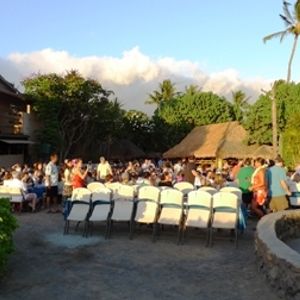 On August 9, 2009, I participated with my family of three. We had seen shows in Waikiki before, but this was our first time attending an outdoor luau show. Most participants were from the mainland or foreign countries, and we were the only Japanese group that day. There were about 3% of people of Asian descent, but everyone spoke English fluently, and we communicated in English with those sitting next to us. We also did our best to enjoy ourselves with our limited English. Communication is all about the mindset... I learned how to give tips to the staff by watching others. The show started as the venue was bathed in the orange glow of dusk, and I thought it was a wonderful performance, ranging from traditional hula to fire dancing. On the way back, taxis were waiting outside the venue, so we called one over to take us to our hotel. It became a great memory.