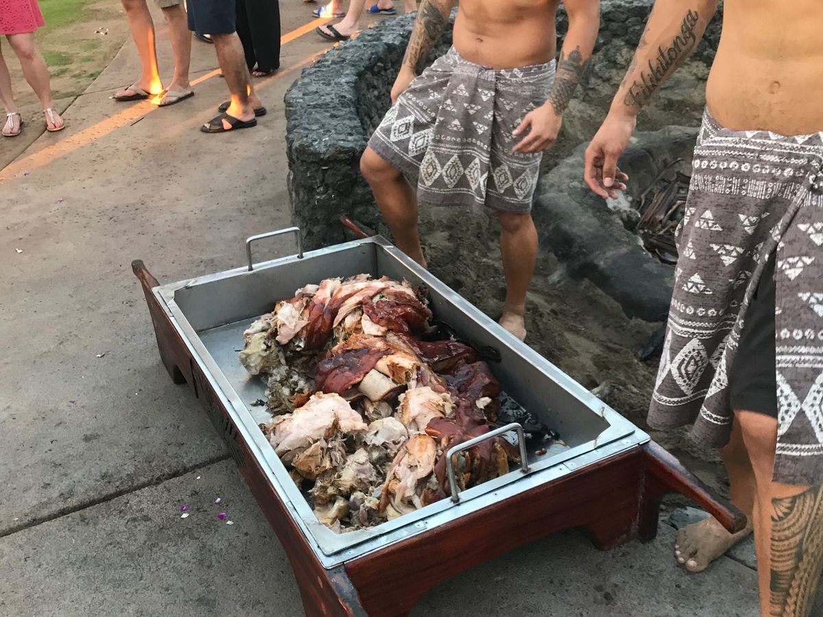 到着数日前には雪の降ったマウイ島、ルアウ当日も結構強い雨でキャンセルになるかと思いきや、一時止んだのでそのまま決行になりました。でも途中からは結構な降りでビニールカッパが配られましたが、料理はびしょぬれでかなり寒く座っているのがつらい感じになり、中座するゲストも相当数いました。出演者の歌声も時々震えてる感じで・・・天気はコントロールできないとは言っても、総合的に見て価格に見合うショーではありませんでした。