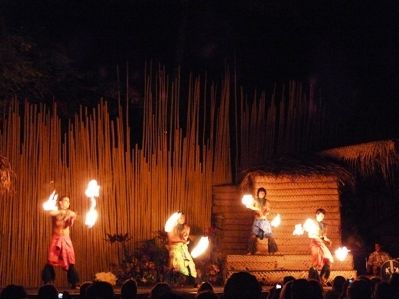 On August 9, 2009, I participated with my family of three. We had seen shows in Waikiki before, but this was our first time attending an outdoor luau show. Most participants were from the mainland or foreign countries, and we were the only Japanese group that day. There were about 3% of people of Asian descent, but everyone spoke English fluently, and we communicated in English with those sitting next to us. We also did our best to enjoy ourselves with our limited English. Communication is all about the mindset... I learned how to give tips to the staff by watching others. The show started as the venue was bathed in the orange glow of dusk, and I thought it was a wonderful performance, ranging from traditional hula to fire dancing. On the way back, taxis were waiting outside the venue, so we called one over to take us to our hotel. It became a great memory.