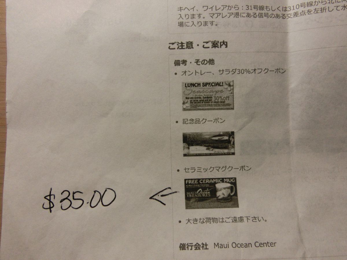 記念品クーポン・セラミックマグクーポンを貰えるようので、ディスカウントがないにもかかわらず事前購入しましたが、土産物を35ドル以上買わないと対象外とのこと。