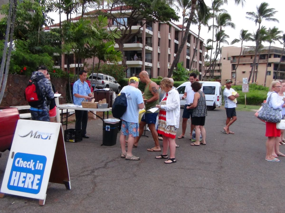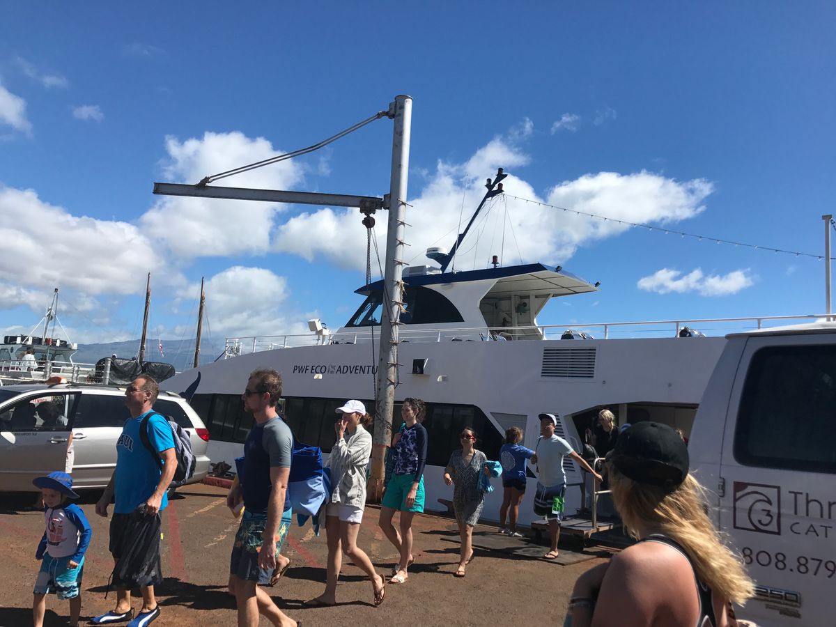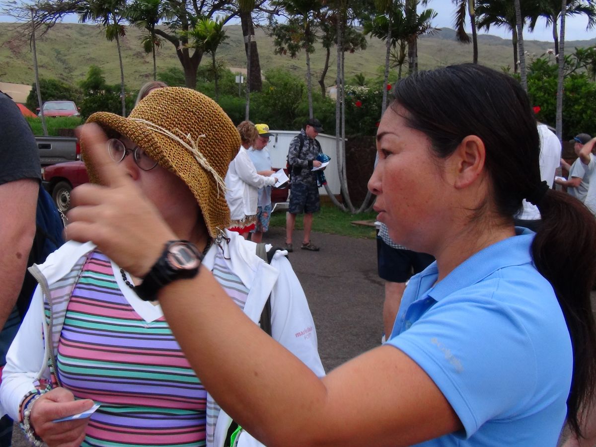 桟橋に着くとcheck inと書いてある場所で署名など(日本語で書いてある物もありました、写真1)して、コーヒーを一杯。船はプラウドオブマウイ号乗船前に記念写真(20$買わなくてよい)、乗船後朝食イチゴ・パイナップル・パン・ケーキ・飲み物(写真2・3)イチゴがアマオウみたいに大きくパイナップルは甘かった。数年前に行ったツアーではシュノーケルセットと足ひれしかなくて、かなり深いモロキニ島で怖かったので今回は日本から簡易のライフベストを持参しました。このツアーでは、ライフベスト(写真7)はもちろん脇の下に挟んで使う長い棒(写真4)、スエットスーツ(写真5)、お腹に巻いて使う(写真6)などがあり体一つで参加できました。有料でスヌーバ(写真8)、レンタル水中カメラ(写真9)もありました。昼食はハンバーガー、パンにケチャップなどをかけ、野菜類をのせ、最後には船尾で焼いている具(ハンバーグの上にチーズ、照り焼きチキン、大きいソーセージ)から選びます。おすすめはチーズバーガーだそうですが、私はチキンバーガーにして食べましたが結構おいしかった。まだ食べれる人は全員が終わった後にもう一度並んで作って食べてもよいそうでした、15人ぶんぐらい余ってました。食事は最初に並ばないと待ち時間ばかり長くてなど、日本人ガイドの佐藤さんが親切にいろいろ日本人の世話をしてくれます。外人さんが多いツアーですが何の心配もいりません、モロキニ島ならこのツアーがベストです。港に戻る前に煎餅一枚でました。日本人ガイドの佐藤さん(写真10)には妻が海の中で餌ずけをして苦しそうにしていた時にも助けていただきました。他にもサーフボードに乗って監視してくれていた外人のお兄さんにも助けてもらいました、私一人では二重遭難になるとこでした。有料のものもあるのでお金を持っていくのと、荷物を置く場所は座るとこか、座る下しかないので濡れます。濡れても大丈夫なビニール袋などを持参したほうがいいと思います。カメは海に浮かんでいるのが見れました、モロキニ島にかなり近くまで寄ってもらえます、海の流れがモロキニ島へ向かって流れているので注意しないと島にぶつかったりサンゴを踏んでしまいます。クジラに出会えなかったのとハナウマ湾みたいに小さな魚がいなかったので、評価をよかったにしました。