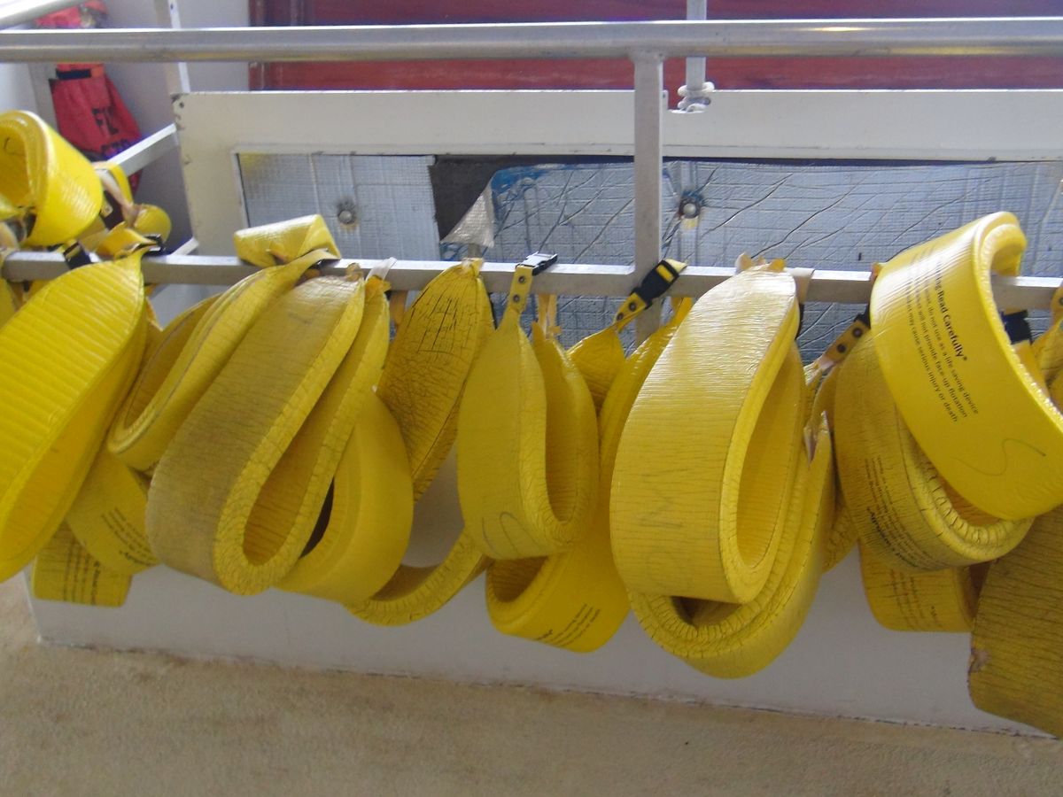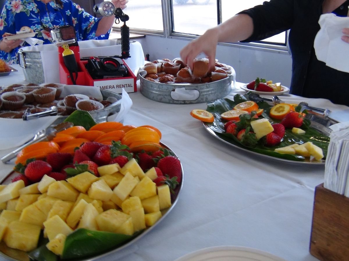 When we arrived at the pier, we signed in at a designated area (there were some materials in Japanese, see photo 1) and enjoyed a cup of coffee. Before boarding the Pride of Maui, we took a commemorative photo (you don't have to buy it for $20). After boarding, breakfast included strawberries, pineapple, bread, cake, and drinks (see photos 2 and 3). The strawberries were huge like Amaou, and the pineapple was sweet. On a tour I took a few years ago, there were only snorkel sets and fins, and I was quite scared in the deep waters of Molokini, so this time I brought a simple life jacket from Japan. On this tour, there were life jackets (see photo 7), of course, a long pole to use under the armpits (see photo 4), a wetsuit (see photo 5), and a belly wrap (see photo 6), so you could participate with just your body. There were also paid options for snuba (see photo 8) and rental underwater cameras (see photo 9).