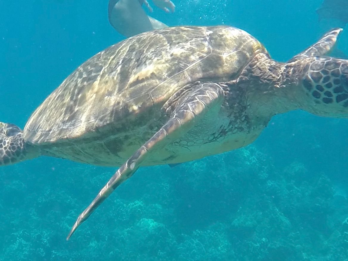 モロキニ島周辺は、透明度が高く、魚がキレイに見られます。海岸沿いはサンゴがあるので魚を近くで見られますが、波があるので近づきすぎには注意してください。海水もさほど冷たくなく、シュノーケリング時間の約1時間があっという間でした。その後、私的には本命だったウミガメの遭遇率が高いポイントへ移動。サーフボードに乗ったタカコさんがウミガメを見つけて周りに知らせてくれてた声を聞いて、最初のウミガメに出会うことができました。その後も合計4匹の大小様々なウミガメに出会い、1匹は横を向いたらすぐそばを泳いでいて、避けなきゃいけないと思いつつ、写真を撮ることに夢中になってしまいました。もちろん後でタカコさんに優しくたしなめられました、ごめんなさい。でも、とても素敵な時間を過ごせたポイント。幸運だったなと感謝しました。