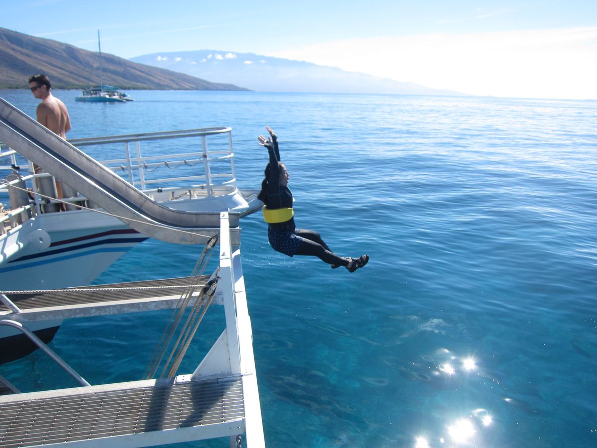 The waves were strong, so we couldn't dive at Molokini Island, but the weather was great, and the drinks and food were excellent! We were able to swim with sea turtles and see dolphins swimming alongside the boat, which was a valuable experience.