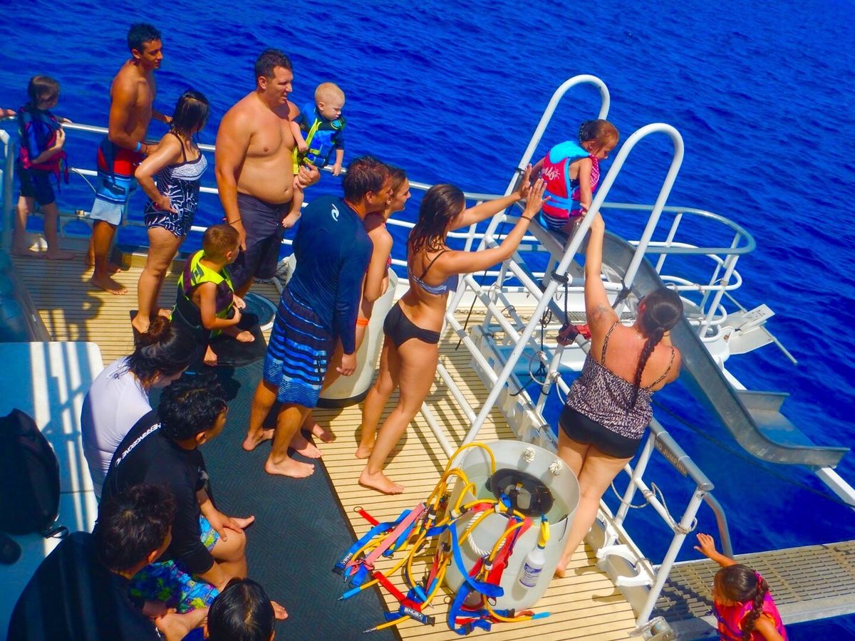 We participated in this for our honeymoon. My husband speaks English, but I thought it would be reassuring to have a Japanese guide, so we signed up. Our guide, Takako, was a wonderful person who helped us a lot, allowing us to enjoy ourselves with peace of mind. The boat sways quite a bit, so it's better to take motion sickness medication beforehand. The sea was very beautiful, and we saw many fish. We were very satisfied to see three sea turtles up close, so much so that we felt like we were too close and had to back away from them. There was a slide from the boat into the sea, which was surprisingly fun, and I ended up going down it multiple times like a child! There was also a shower on board, and since the weather was nice, it wasn't cold at all. We had a delicious hamburger for lunch, and at the end, they served alcohol, which I thought was a great deal for the price.