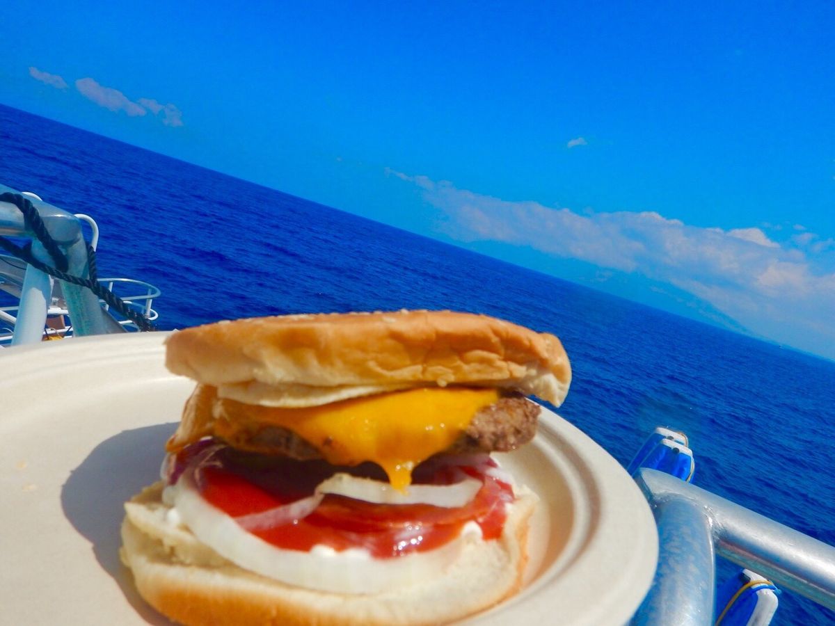 船上では十分な飲み物と朝食・昼食をいただけます。バーベキューグリルまで完備されており、作り立てのハンバーガーが美味しかった!!