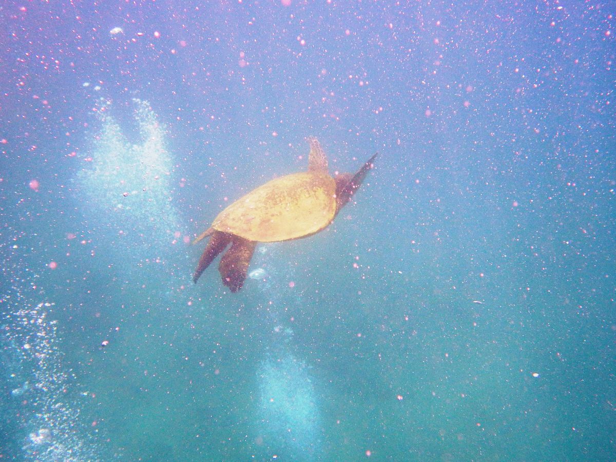 1時間ほどして、次のウミガメポイントへ。水はあまりきれいでなかったので、ウミガメが見れるかどうか心配だったのですが、ほぼ一番乗りで海に入ったのが幸いで、すぐに1頭に遭遇しました。まだ、あまり人がいなかったので、ゆったり泳いでいる姿を堪能できました。ここでも1時間近く泳いでいましたが、モロキニに比べ魚も少なく、やっぱり目当てはウミガメ。そろそろ終わりかという時に、少し離れたところにカメがいるとガイドの人が教えてくれたので、全速力でそちらに向かい2頭目を見ることができました。