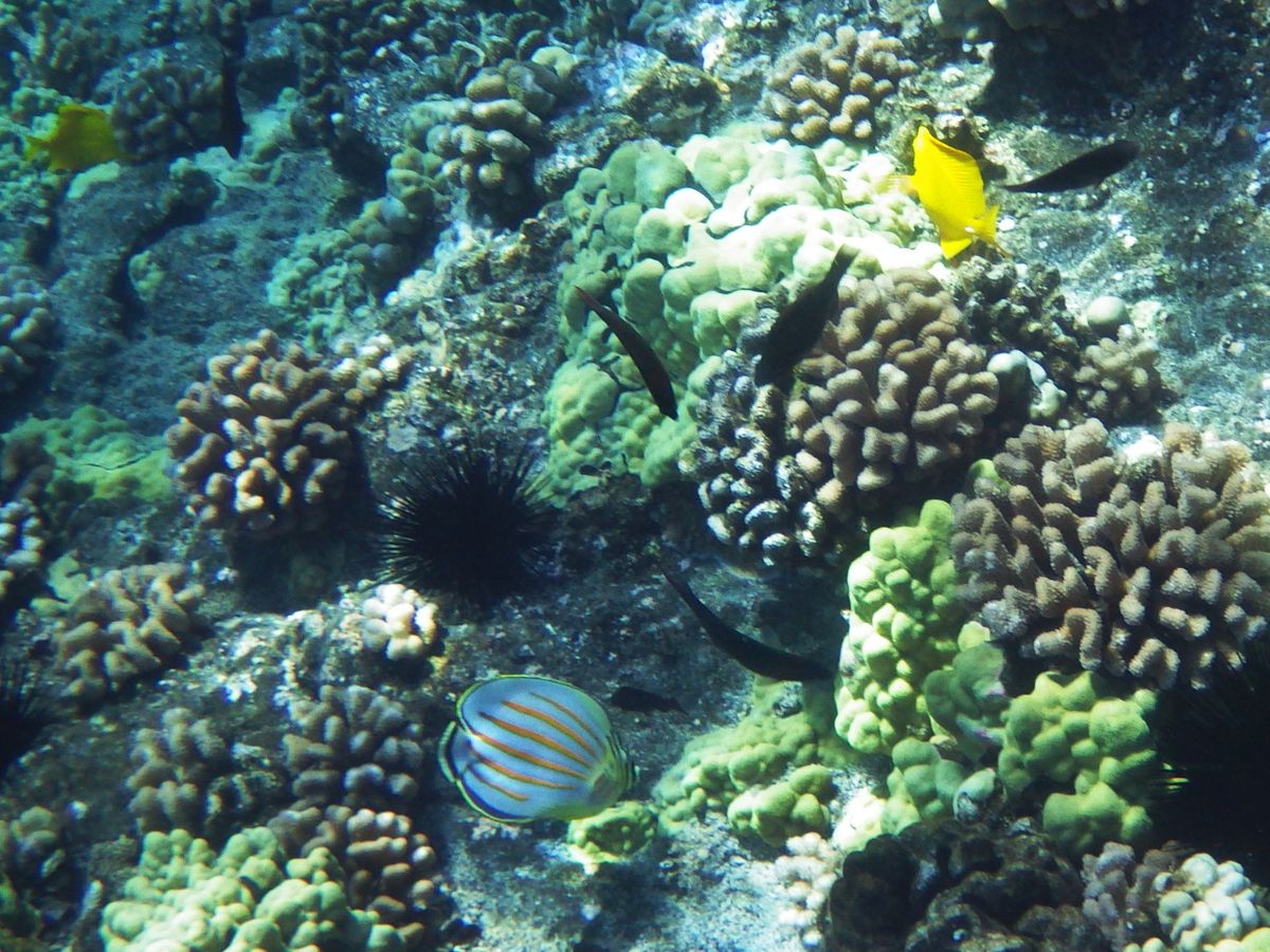 昨年ハワイ島(キャプテンクック)でシュノーケリングをしたときには、水もあまりきれいでなく魚ももう一つだったので、今年もあまり期待をしていなかったのですが、モロキニ島は、結構水もきれいで魚もたくさんいました。パイプウニヤカワハギ系の魚、チョウチョウウオも数種類いて、まあ、満足。