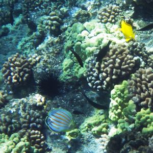 昨年ハワイ島(キャプテンクック)でシュノーケリングをしたときには、水もあまりきれいでなく魚ももう一つだったので、今年もあまり期待をしていなかったのですが、モロキニ島は、結構水もきれいで魚もたくさんいました。パイプウニヤカワハギ系の魚、チョウチョウウオも数種類いて、まあ、満足。