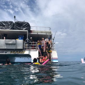 The snorkeling at Molokini Island has excellent visibility, but unfortunately, there are very few fish, and they are mostly small. The later cruise to see the sea turtles was canceled due to weather conditions. The staff members are kind and attentive, and the breakfast and lunch burgers are good.