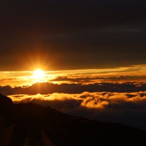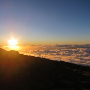 当日の天候が朝から良くなかったのですが夕方近くから日差しが見えてきて頂上では雲の隙間から太陽がのぞいてきました。ハワイ島方向の巨大クレーターは、ガスがかかって全体を見ることはできませんでしたが、その反対方向にはオレンジの夕日が足元から広がる雲海の遥か先にゆっくりと、最後に一瞬緑に光って消えていきます。それを見守る人々はオレンジのスクリーンに映る影絵の様相。すっかり夕闇に包まれたころ頂上から少し降りたところで星空を見せてくれました。圧倒的に夜空を覆い尽くして輝く星々、大空を大河のように横切って流れる銀河はまさに銀の河、天の川。「こんなの子どもの頃に見たきりだ」と相方とうなづきあった後、二台の望遠鏡で見せてくれた大マゼラン星雲、木星や縦長の輪に囲まれた土星。