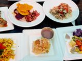 There's no buffet, but small huts that serve dishes. You can get seconds... Thirds... Or more. The poke taro chips, grilled chicken and the Hawaiian roll were delightful. Bottled Jason Mamoa water was provided. The wait staff was quick to remove finished plates too! As with any outdoor luaus, there will be bugs. Use bug spray and maybe bring a hand fan to shoo them away.