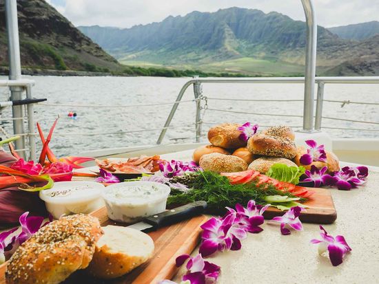 Exclusively available on Saturday morning sails, enjoy freshly baked bagels and rich, creamy cream cheese from Honolulu’s popular Big Time Bagels. Served with classic fixings, this light breakfast is the perfect treat as you relax on deck, sip your drink, and watch for humpback whales on Oahu.