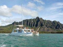 Join Kualoa Ranch on the best Kaneohe Bay boat tour, and explore the area on a relaxing fishpond boat tour, followed by an ocean voyage on a catamaran. Enjoy incredible views of the famous Jurassic Valley mountains, Chinaman's Hat, and Hokulea Beach.