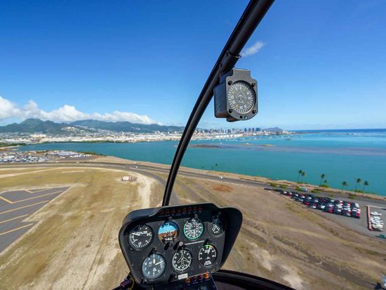 As you lift off from the heliport, you’ll be treated to incredible views of Pearl Harbor and Hickam Air Force Base before beginning your aerial journey over Oahu’s crystal-clear beaches, cascading waterfalls, lush green valleys, and the ancient craters of Diamond Head and Koko Head.