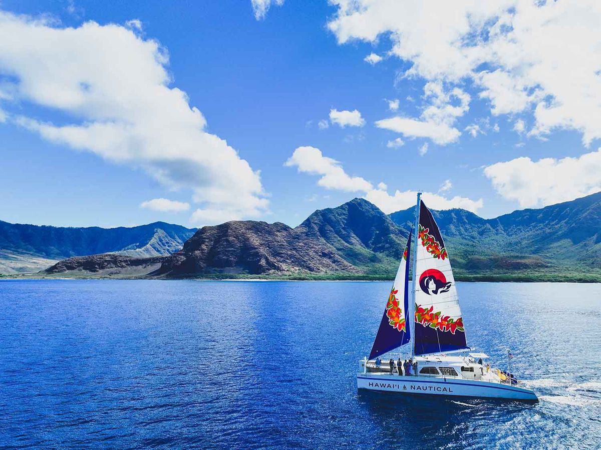 Experience a luxury sunset sail from Ko Olina featuring a unique dockside Hawaiian welcome with live music and hula before boarding. Cruise along west Oahu aboard a spacious catamaran while enjoying cultural storytelling, ocean views and an open bar.