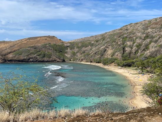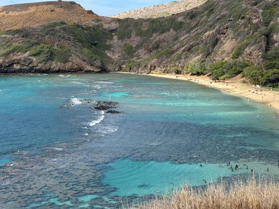 海外でのシュノーケリングは初体験だったので、日本語ガイド付きという点でとても安心でした。また、普通のビーチと違い、入場制限や入場時の啓発ビデオ視聴が義務付けられているハナウマ湾ならではの体験ができました。ウミガメとの遭遇も3回もあり、レンタルしたカメラでもいい写真や動画を撮ることができました。また、サンゴ礁の魚たちはサイズが大きくて、見ごたえがありました。シュノーケリング自体は正味1時間ですが、50代半ばの私たちにとってはちょうどいい負荷だったと思います。本当に楽しかったです!11月ということで、ガイドさんのアドバイスにしたがいウエットスーツを着用したので寒さも感じませんでしたし、事前に酔い止めを勧められて服用していたので、波が高くても気分が悪くなることもありませんでした。ガイドさんの適切なアドバイスがとてもありがたかったです。