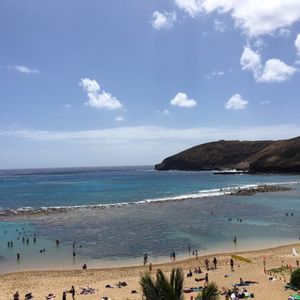 この度は私達のツアーに来ていただき、ありがとうございます。この日はサンゴ礁が海面から出ているくらいの引き潮に当たり、サンゴ礁の上を泳ぐことができないために砂地の深め所に人が集まってしまうんですね。ごめんなさいね。でも引き潮の時の方が透明度は良いですからお魚は見やすかったかと思います。是非次回はハナウマベイでの体験ダイビングにも挑戦してみてください。ダイビングでは海の状態が良ければ、白ブイを超えて沖の方まで行きますので人口密度も高くないですし、もっともっとハナウマ湾を楽しんでいただけるかと思います。またお会いできるのを楽しみにしております。ありがとうございました。Mahalo!!