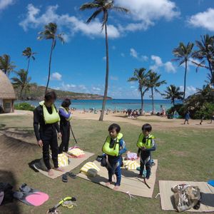 The snorkeling tour with the three-generation family was so much fun! I was really happy to see everyone trying their best. Even the grandparents, who initially planned not to swim, did very well and were able to reach the white buoy in the backyard, where we saw a large school of ladyfish. Please come again when you visit Hawaii. Next time, let's all swim out together to see the cute turtles in Hanauma! I look forward to seeing you all again. Thank you! Mahalo!!