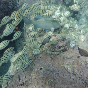 小学生の息子と高校生の娘と3人での参加でした。外国人のガイドさんでしたが、日本語はお上手で。シュノーケリングの方法も最初に簡単ですが、教えてくださいます。途中からピッチが上がり、あっという間に海に連れて行かれ、少々ドキドキしましたが、すぐに海に慣れました。宝石のような無数のお魚を追いかけながら、あっという間に時間がたちました。もう少しお魚と戯れたかったですが、それは今度のお楽しみにしようと思います。風がとても強く寒かったのですが、飲み物が付くといっていたのにいただけず…。なので、飲み物は持参したほうがよいです。スナックは頂けました。寒いので小休憩もそこそこにあっという間のシュノーケリングツアーでした。総じて楽しめました。