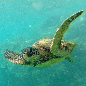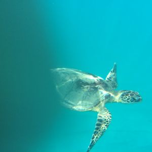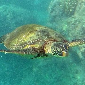還暦を過ぎた夫婦が、異国ということで年も傍目も考えず、初めてのシュノーケリングに挑戦しました。当初は、熱帯魚の二三匹も見られればいいなぁという感じでしたが、いざ入ってみるとたくさんの熱帯魚と共に、なんとホヌ(亀さん)までもが、海底から目の前の海面までスイスイと泳ぎあがってきたのには同行した方とともにビックリ。残念ながら妻はそれを見なかったという悲劇!