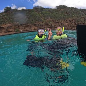 Thank you for joining the tour. Since you went on the tour right after arriving in Hawaii, I imagine you must have been quite tired. Also, the malasadas you had in the car might not have been the best idea before snorkeling. I apologize for that. Both of you were very skilled at snorkeling, so please do challenge yourselves again when you come back to Hawaii. We are always here waiting for you. Thank you. Mahalo!!